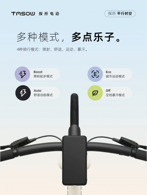 在智能化方面,探所平行时空ebike搭载了TASOW自主研发的自适应助力系统与BAFANG内变速一体电机。该系统通过力矩、陀螺仪、转速、坐垫重力四大传感器,实时感知骑行状态与路况,自动调节电机输出功率,实现平滑自然的“无感动力辅助”。车辆提供Boost弹射、Eco节能、Auto巡航、Off暴汗四种骑行模式,其高达100公里的超长续航能力,可轻松应对通勤、郊游、露营等多种生活场景。更值得一提的是,车辆支持OTA在线升级,能像智能汽车一样持续解锁新功能,确保骑行体验不断进化。